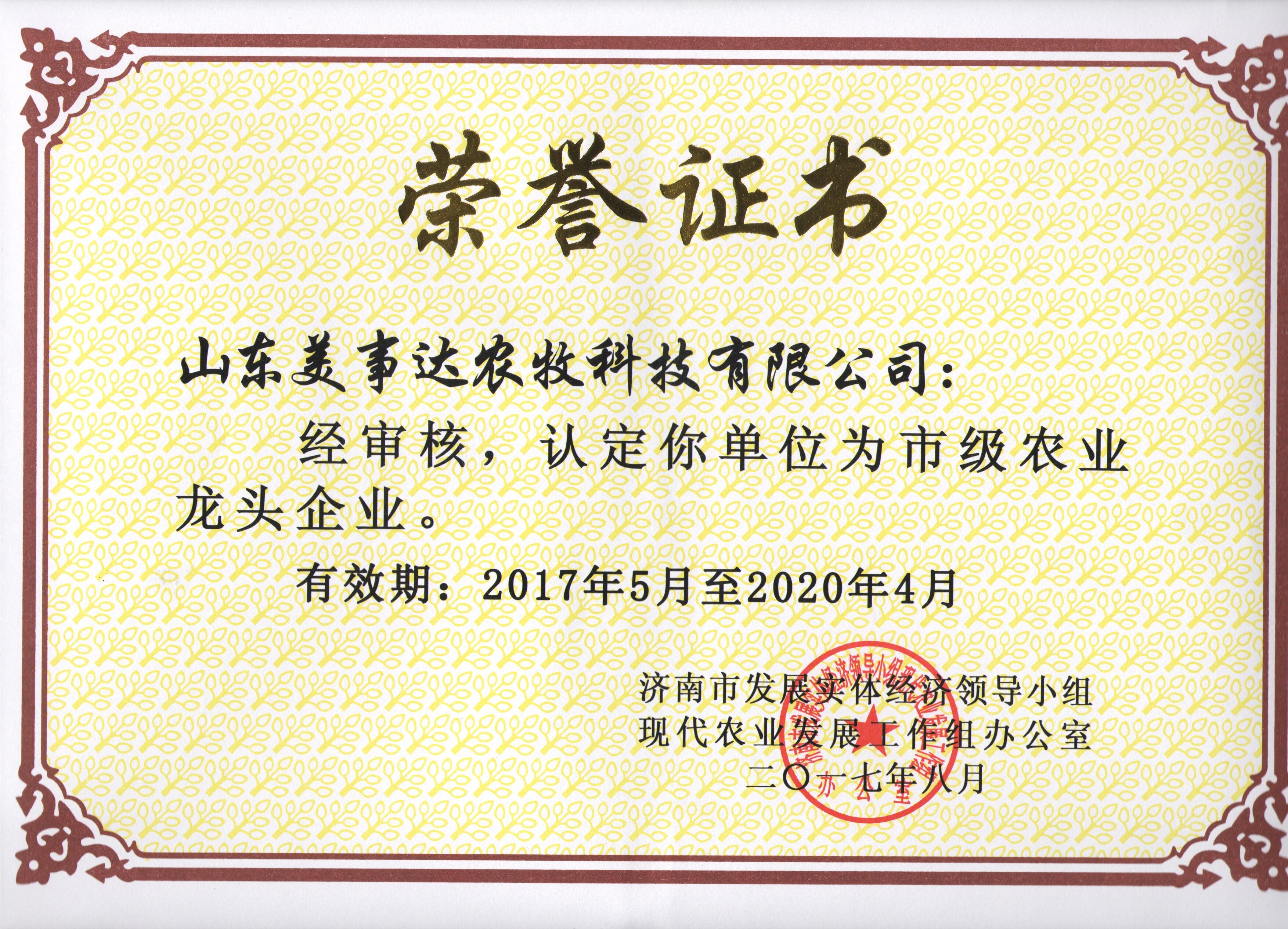熱烈祝賀我公司獲評市級農業龍頭企業!