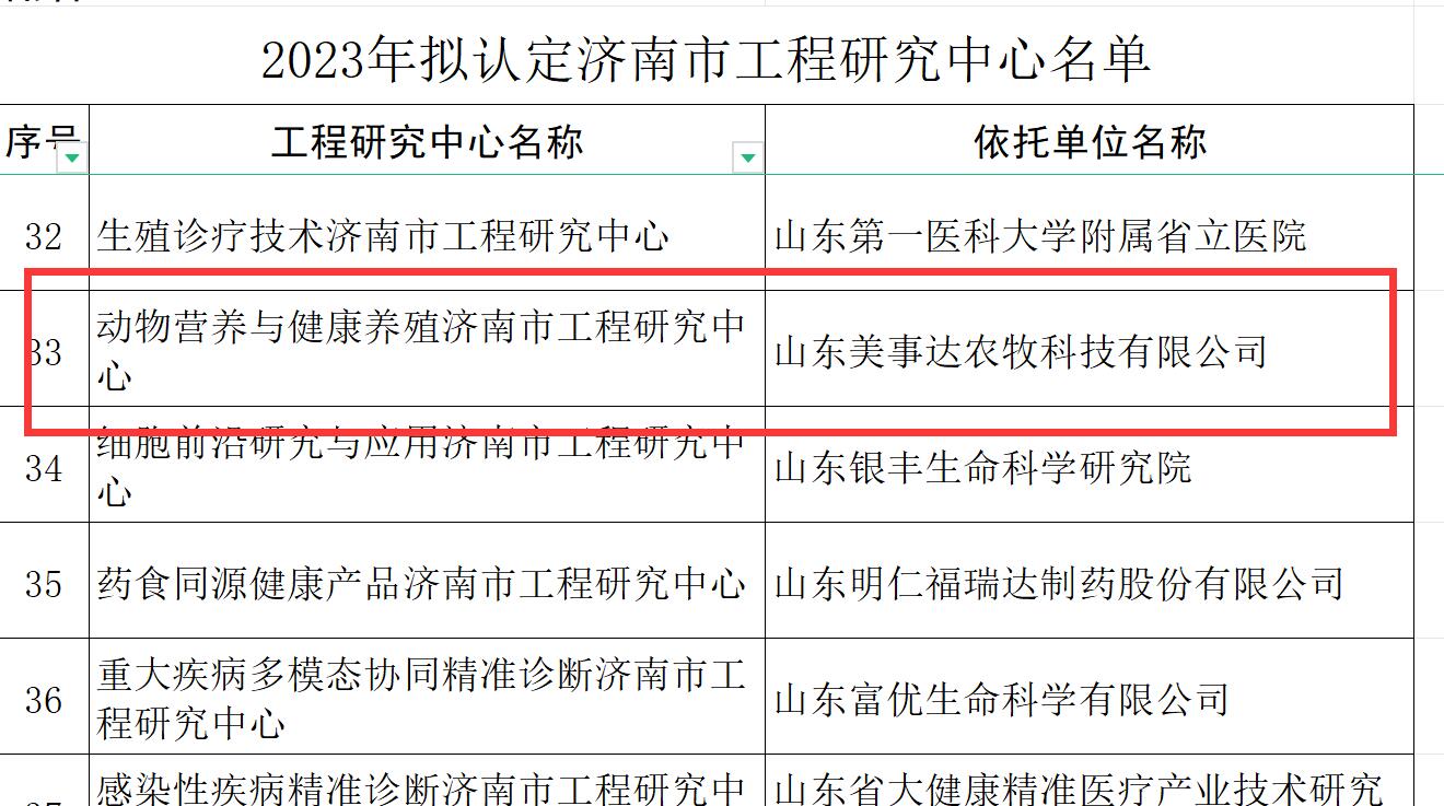? ? 近日,濟南市發展與改革委員會公示了“2023年濟南市工程研究中名單”,山東美事達農牧科技有限公司被認定為“動物營養與健康養殖濟南市工程研究中心”。