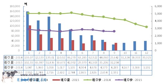 2015年1-9月份中國進口苜蓿草總計93.44萬噸,同比增46.13%;進口燕麥干草總計11.52萬噸,同比增36.51%。進口牧草的大幅增加,說明規模牛場的生產仍在不斷擴張,并且生產的積極性較高。