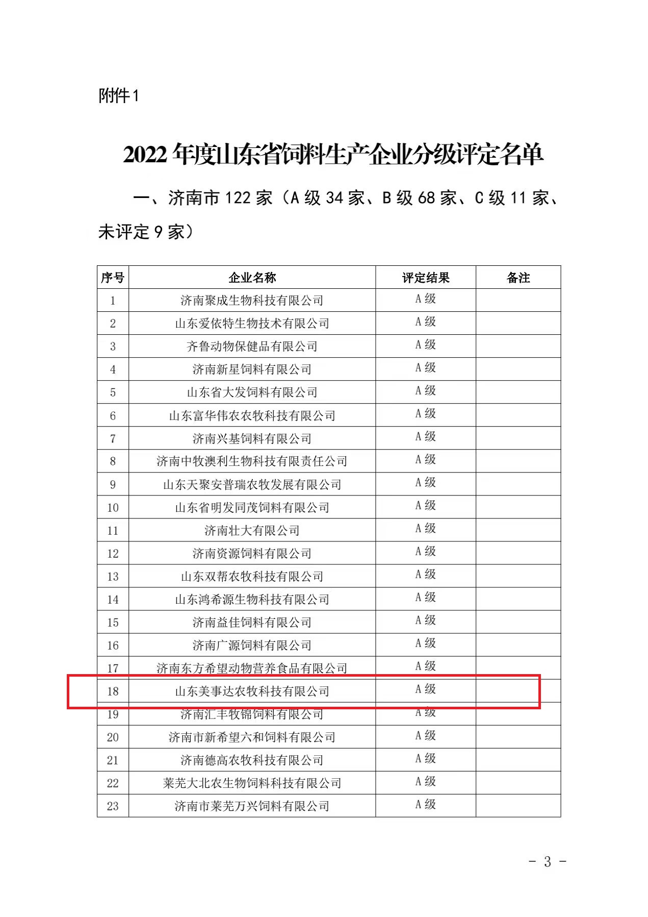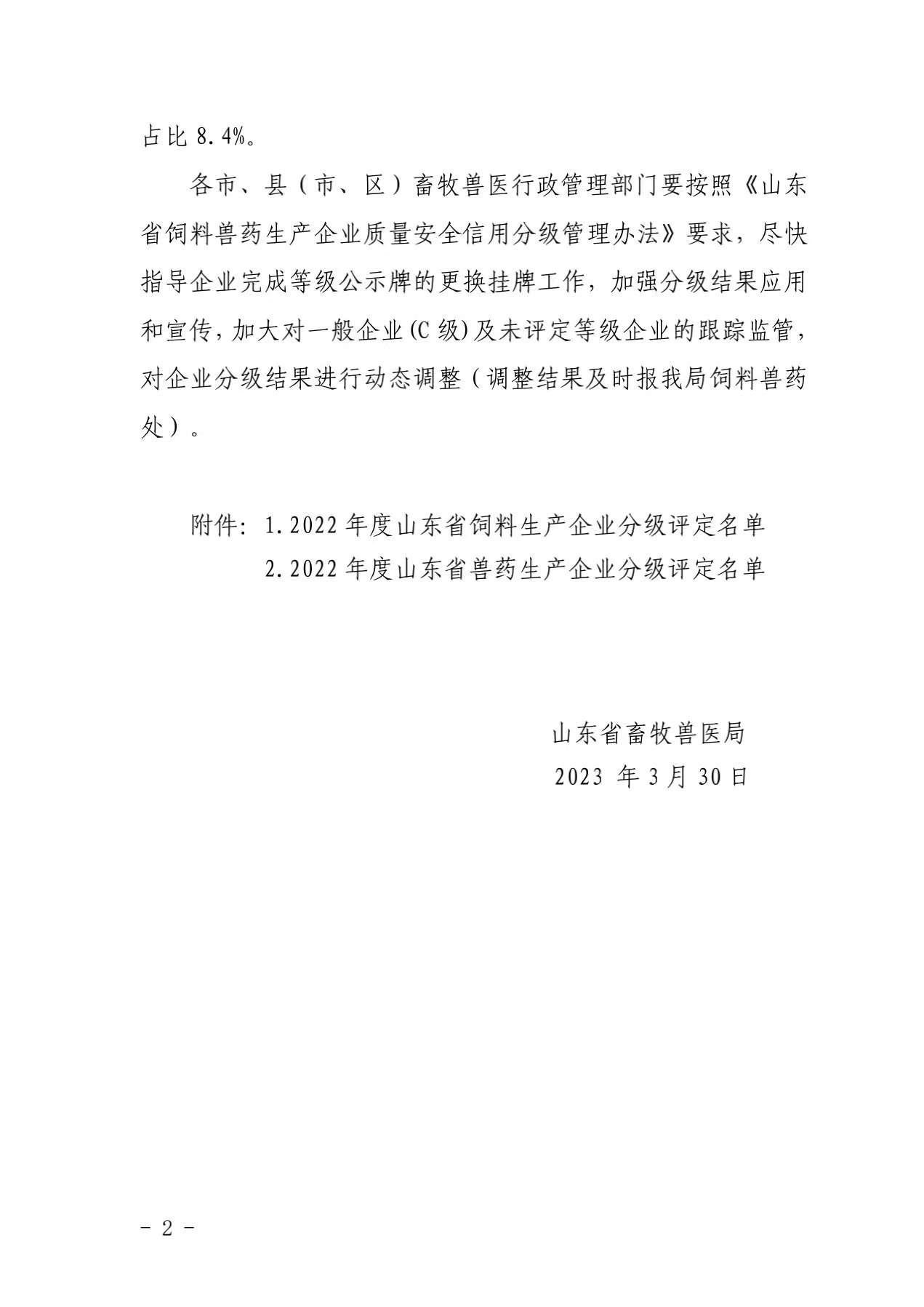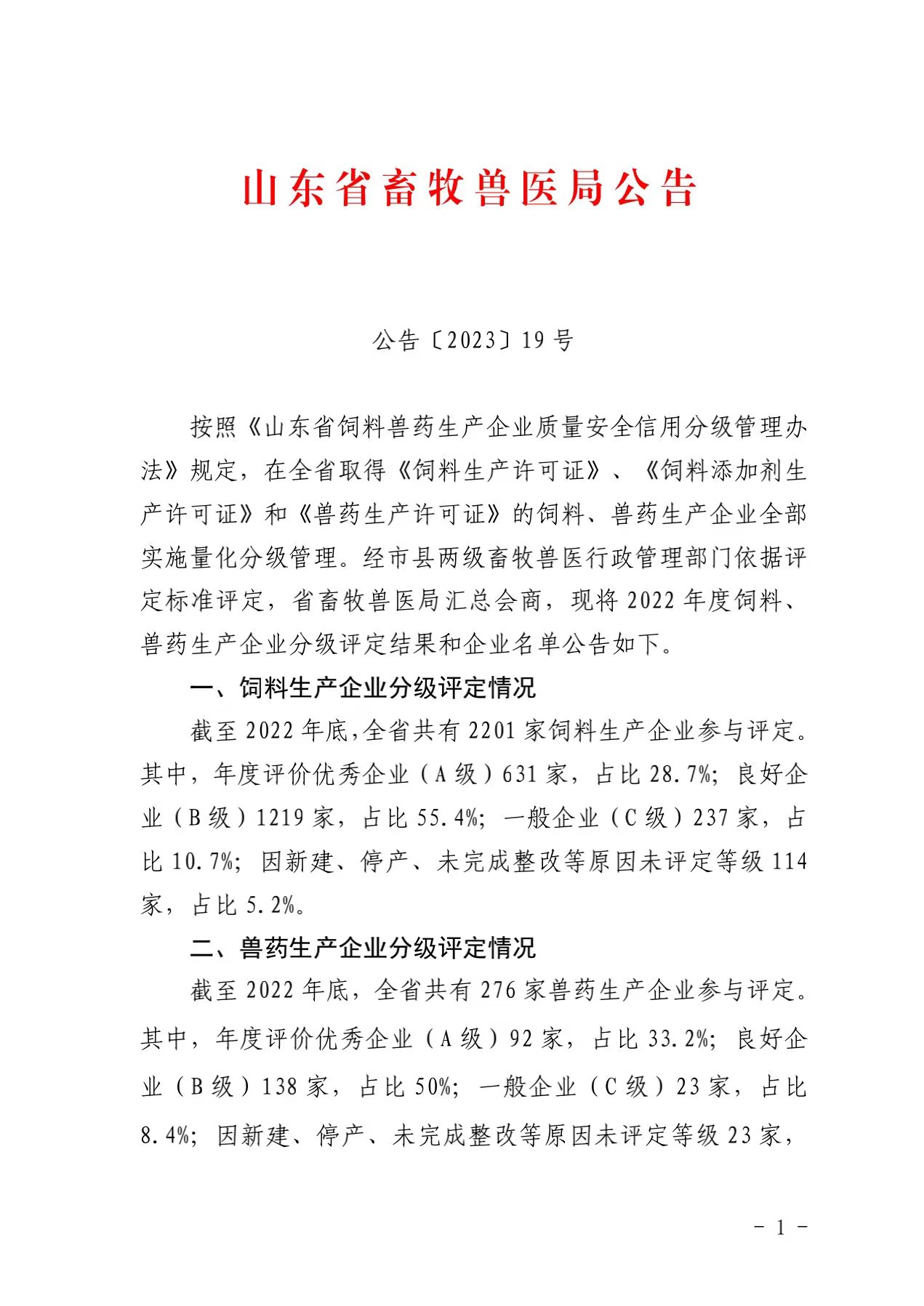 山東省畜牧獸醫局發布《2022年度飼料獸藥生產企業分級評定結果公告》
