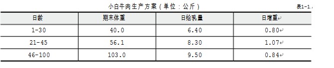 (1)小白牛肉生產:犢牛從出生至3月齡或100天,完全靠牛乳、脫脂乳或代用乳來飼喂,不喂給 其他任何飼料,甚至連墊草也不能讓其采食,體重達100公斤左右時出欄或屠宰,其肉質細嫩,味道 鮮美,肉色為全白色或稍帶淺粉色,近似雞肉,帶有乳香氣味,營養價值較高。生產小白牛肉要選擇 優良的肉用品種、乳用品種、兼用品種或雜交牛的牛犢,要求體質健康、消化吸收機能強、生長發育 快,初生重在38~45公斤。其生產方案見表1-1。
