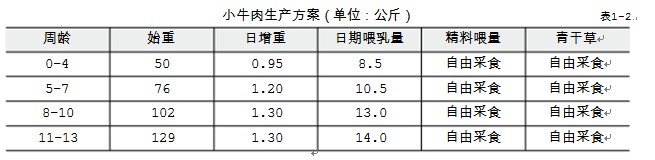 (2)小牛肉生產:指犢牛出生后至6~8月齡,在特殊飼養條件下育肥至一定體重時出欄或屠宰的方 式。即初生犢牛隨母哺乳或人工哺乳,但出生3天后必須由人工哺乳。1月齡內可按體重的8%~9%喂 給牛奶,精料量逐漸增加至0.5~0.6公斤。1月齡后日喂奶量基本保持不變,精料喂量逐漸增加,粗料 (優質青干草或青草)自由采食。喂牛乳或代用乳直到6月齡為止,可以在此階段出欄,也可以繼續育肥 到7~8月齡或1歲左右出欄或屠宰。其生產方案見表1-2。
