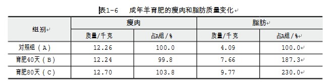 羊的育肥就是應用飼養和管理技術,用盡可能少的飼料獲得盡可能高的日增重,生產出大量優質 的羊肉。因此,要快速育肥、縮短出欄時間、增加經濟效益、掌握科學的育肥技術十分關鍵。育肥期的成年羊已經停止生長發育,增重往往是脂肪的沉積,因此需要大量能量,其營養需要除 熱能外,其他營養成分略低于羔羊。一般品種的成年羊育肥時,達到相同體重的熱能需要高于肉用品 種10%左右,加強成年羊育肥能夠在較短時間內獲得較高的日增重,從而降低單位增重的飼料和勞動 力消耗。羊只在育肥過程中的品質發生很大變化,隨著膘情的改善,羊肉中的水分相對減少,脂肪含 量增加,熱量增加而蛋白質含量相對有所下降。對成年羊不同育肥階段肉和脂肪含量變化的比較研究 證明,成年羊的增重幾乎全是脂肪(見表1-6)。